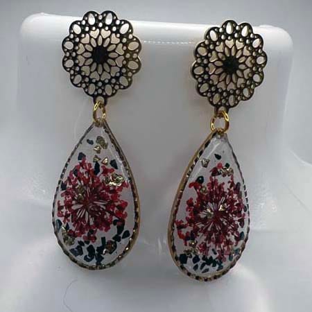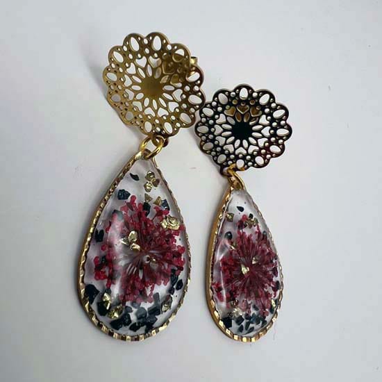 Boucles d'oreilles en résine transparente incrustées de fleurs séchées et de pierres métallisées et en acier inoxydable hypoallergénique doré