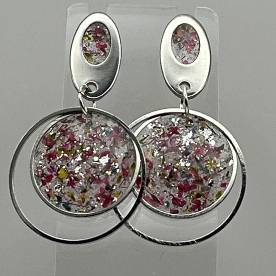 Boucles d'oreilles en acier inoxydable hypoallergénique argenté et en résine transparente incrustée de fleurs séchées et de feuille d'argent