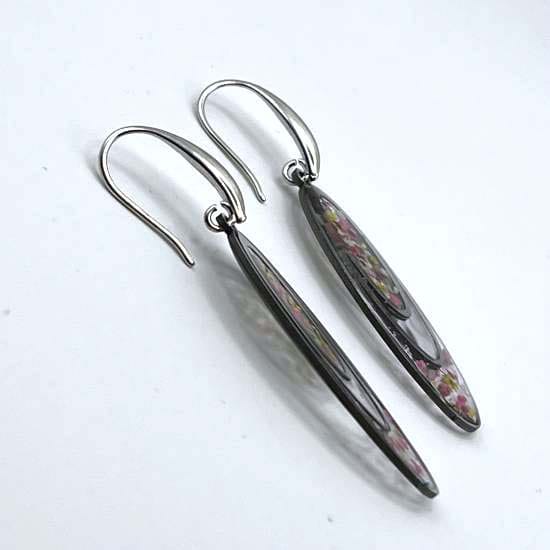 Ces boucles d’oreilles jouent avec la lumière comme des pétales suspendus dans l’air. Les ovales se répondent, s’emboîtent et créent une silhouette graphique où la transparence dialogue avec la délicatesse des fleurs emprisonnées dans la matière. Les touches de rose et de vert apportent une douceur vibrante, tandis que le contour sombre souligne la forme et donne de la profondeur à l’ensemble.
