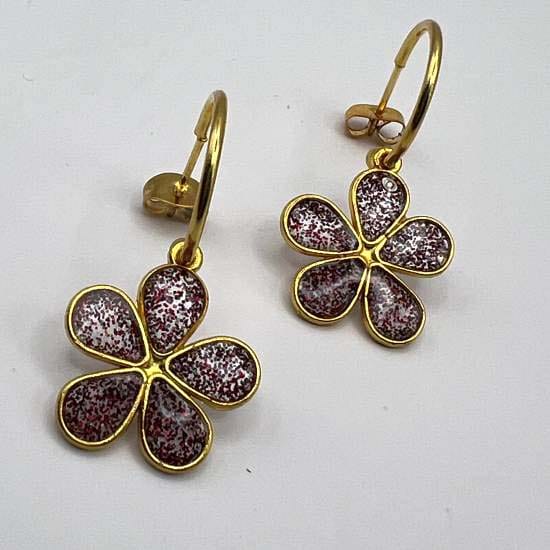 Ces boucles d’oreilles en forme de fleur revisitent le motif végétal avec une touche contemporaine. Chaque pétale est rempli d’un motif éclaté créant un effet texturé et vibrant. Le contour doré et l’attache fine ajoutent une note d’élégance à cette composition audacieuse.