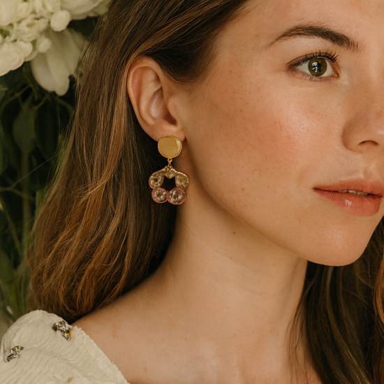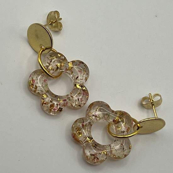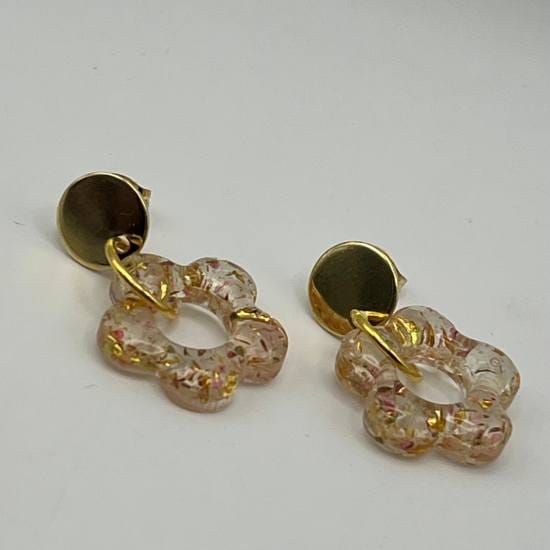 Ces boucles d’oreilles dévoilent une fleur délicate aux pétales translucides, parsemés d’éclats dorés et de touches rosées qui captent la lumière avec douceur. Leur attache ronde et dorée apporte une note chic et intemporelle, tandis que la forme florale crée un bijou féminin, raffiné et résolument unique.