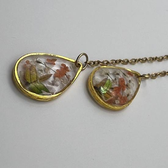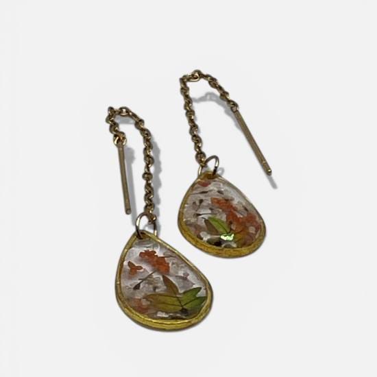 Ces boucles en goutte, suspendues à une fine chaîne dorée, renferment un fragment de nature figée dans la lumière. Des fleurs séchées aux teintes orangées, vertes et brunes s’épanouissent dans une résine cristalline, comme un bouquet d’automne capturé au creux d’un bijou. Le mouvement délicat de la chaîne ajoute une touche de légèreté et de grâce à l’ensemble.