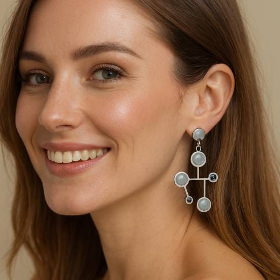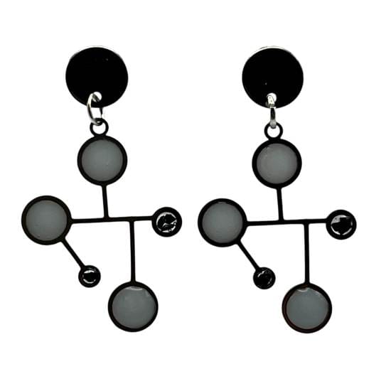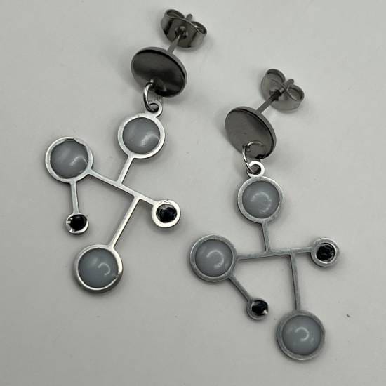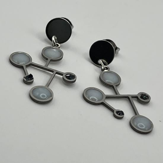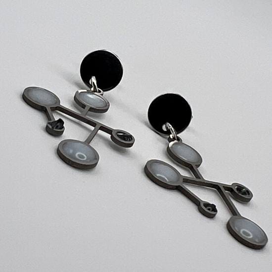 Légères comme une pensée, ces boucles d’oreilles dessinent dans l’air une constellation intime, entre science et mystère. Leur structure délicate, inspirée des formes moléculaires, évoque un univers en équilibre, où chaque cercle semble graviter avec douceur autour d’un centre noir profond.