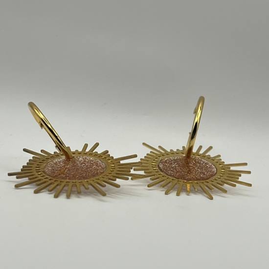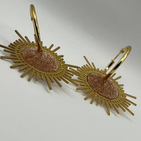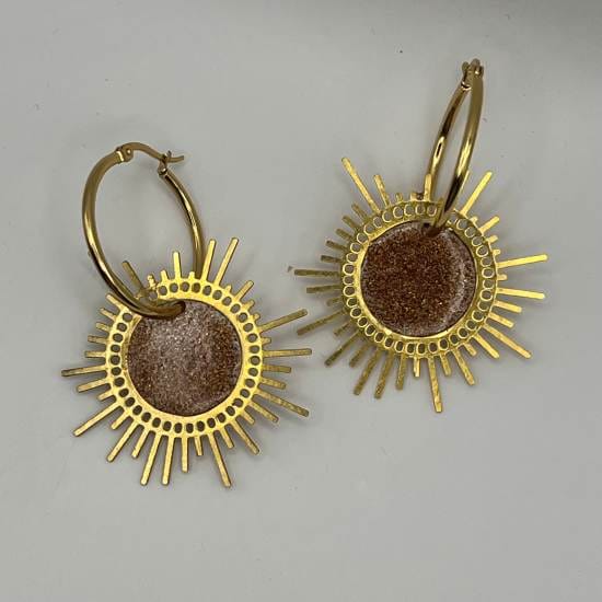 Ces boucles d’oreilles tendance en forme de soleil captent la lumière avec intensité. Le centre pailleté aux reflets bruns est entouré d’un rayonnement doré finement découpé, évoquant la chaleur et la puissance de l’astre. Chaque détail est pensé pour créer un bijou graphique, lumineux et résolument moderne.