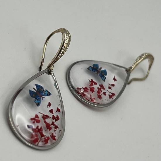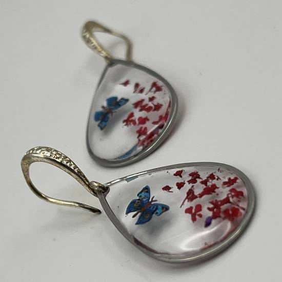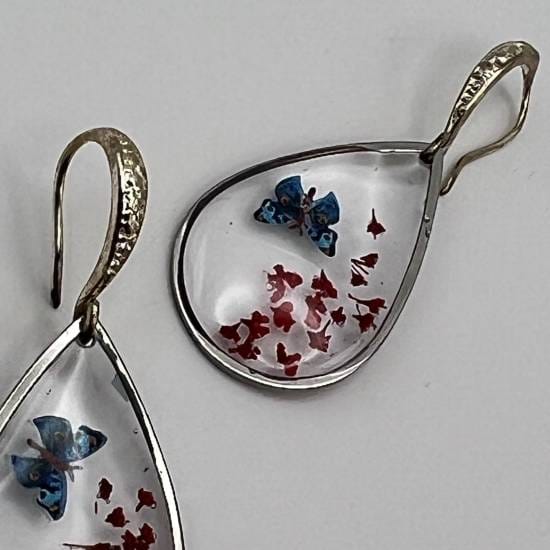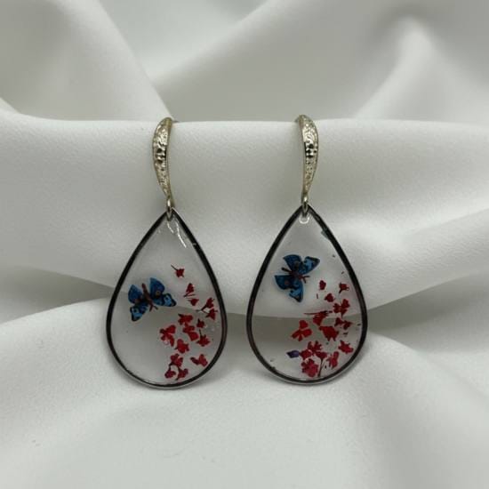 Boucles d'oreilles en acier inoxydable argenté et en résine incrustée de motifs papillons et de fleurs séchées