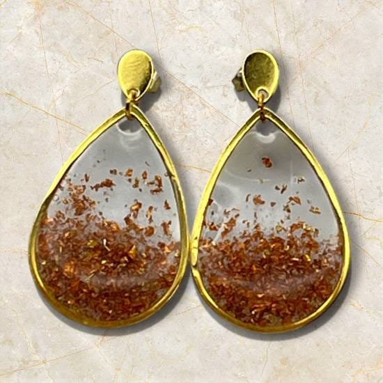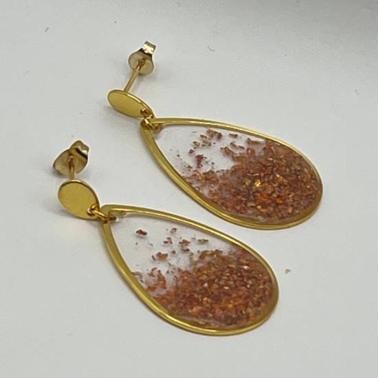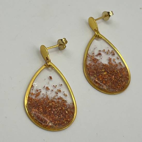 Ces boucles d’oreilles en forme de goutte jouent sur la transparence et la lumière. Leur résine cristalline renferme des éclats cuivrés subtilement concentrés vers la base, créant un effet de dégradé raffiné. Le contour doré et le clou assorti apportent une touche chic et intemporelle à l’ensemble.