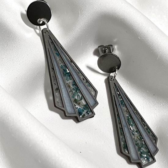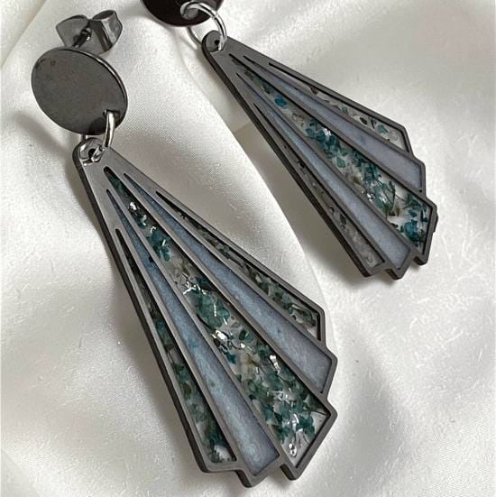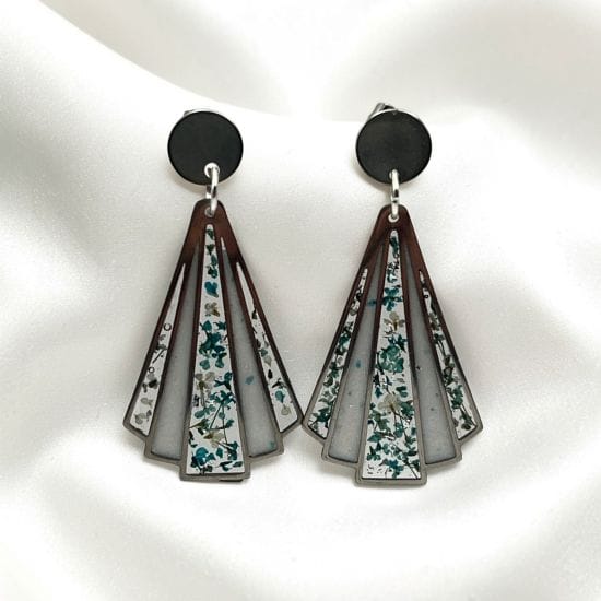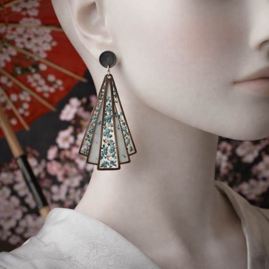 Boucles d’oreilles éventail en résine translucide, parsemées de délicates fleurs séchées bleues et blanches. Leur contraste avec le clou argenté crée une allure moderne et raffinée. Une pièce légère et poétique, parfaite pour apporter une touche artistique à chaque tenue.
