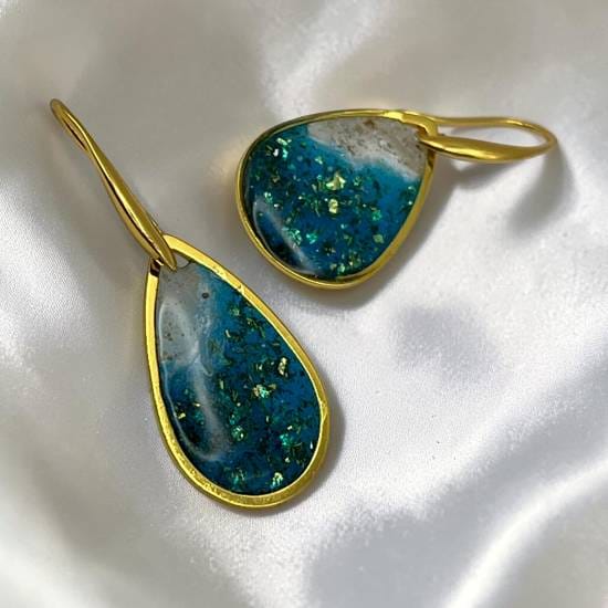 Boucles d’oreilles comme deux gouttes d’horizon, où le sable rencontre l’écume et le bleu profond.
