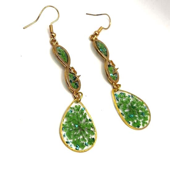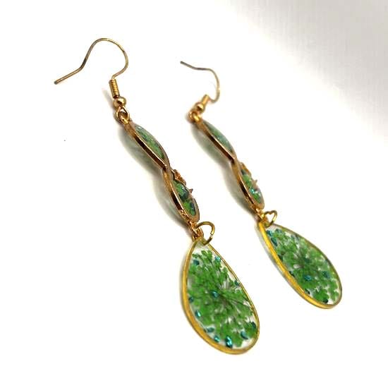 Boucles d'oreilles en acier inoxydable hypoallergénique et en résine transparente incrustée de fleurs séchées et de pierres métallisées.