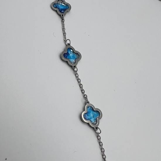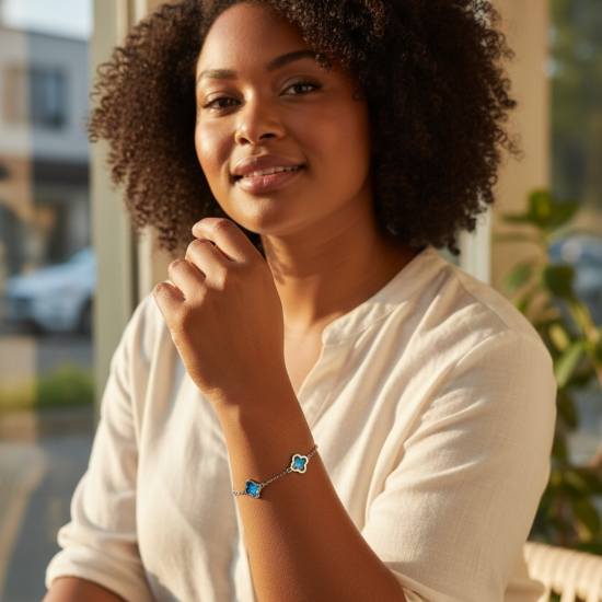 Ce bracelet délicat en argent dévoile cinq trèfles stylisés, chacun serti d’un bleu translucide aux reflets changeants, comme une onde de lumière sur l’eau. Le dégradé subtil, du bleu ciel au bleu nuit, évoque les nuances d’un rêve en mouvement, une promesse discrète portée au poignet.