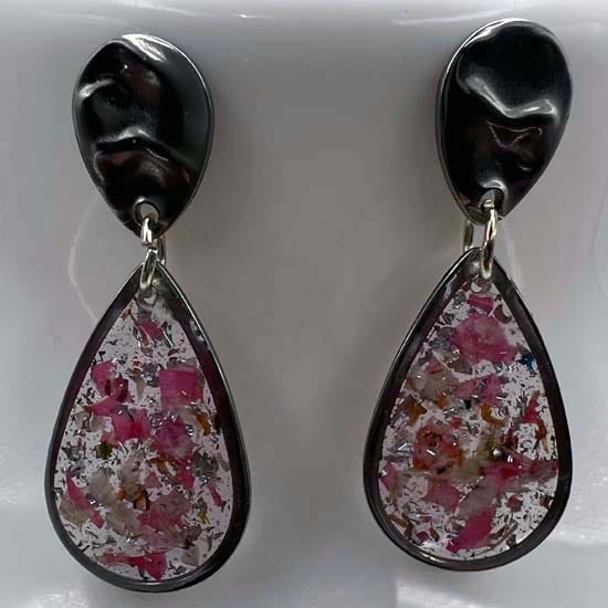 Boucles d'oreilles en acier inoxydable et hypoallergénique argenté et en résine incrustée de fleurs séchées et de feuille d'argent