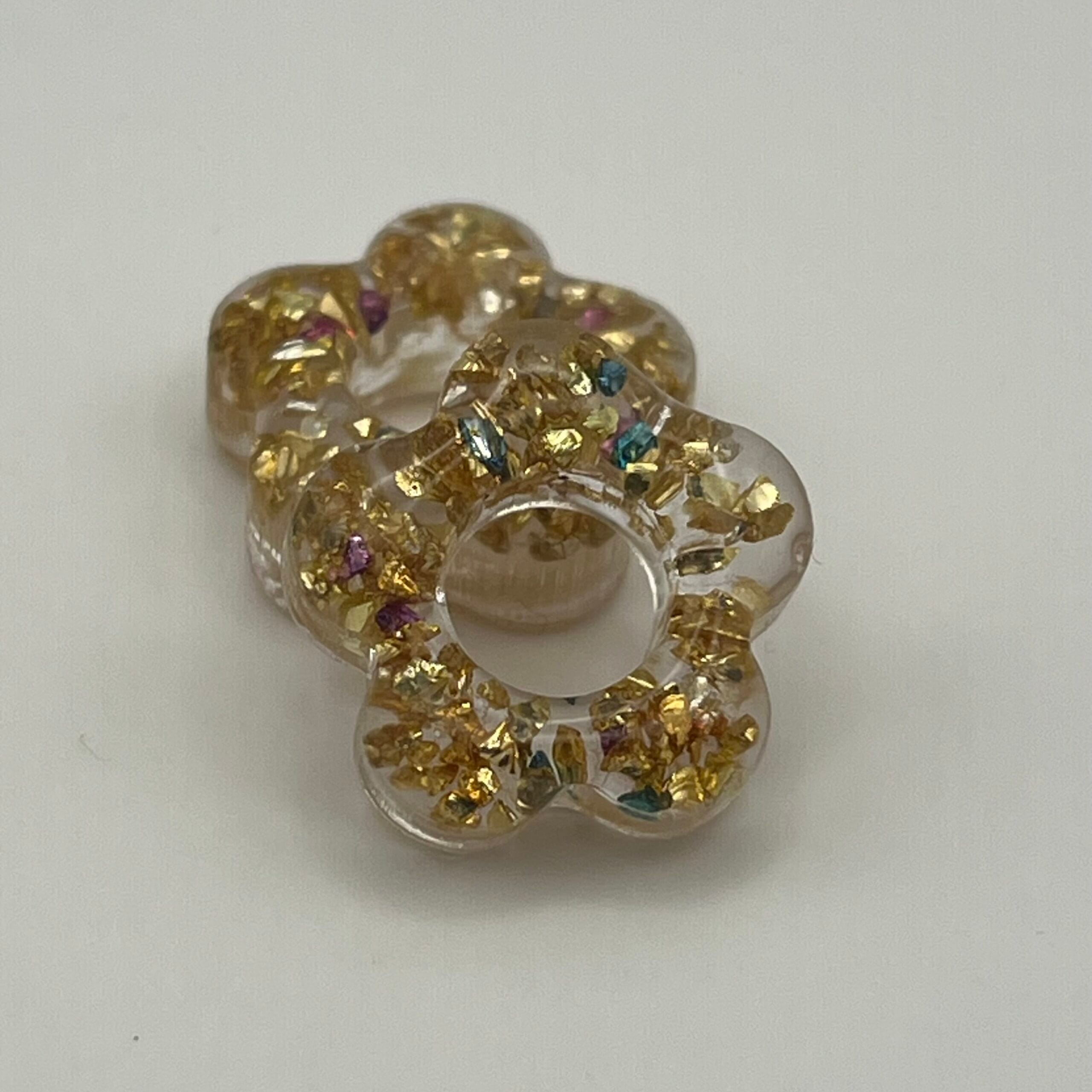 Pampilles en résine incrustées de pierres métallisées or et de quelques pierres métallisées roses et vertes pour donner de la profondeur