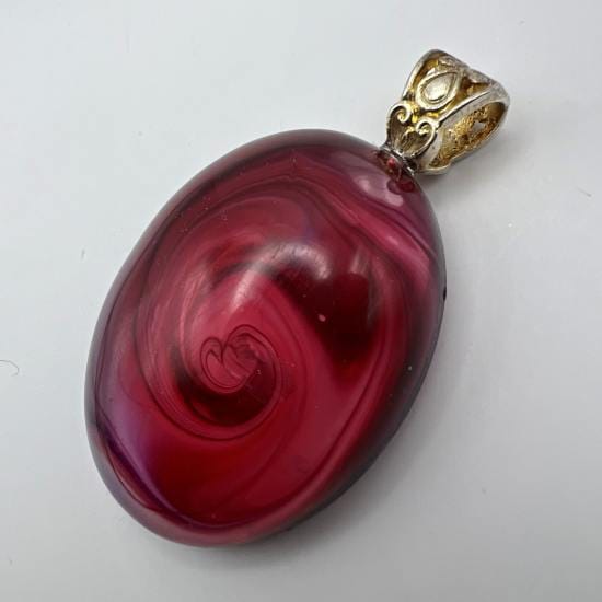 Ce pendentif ovale révèle une surface lisse et brillante, il capte la lumière comme un éclat de passion figé dans la résine. Le sertissage délicat, orné de motifs en arabesques, ajoute une touche de raffinement à cette création artisanale.