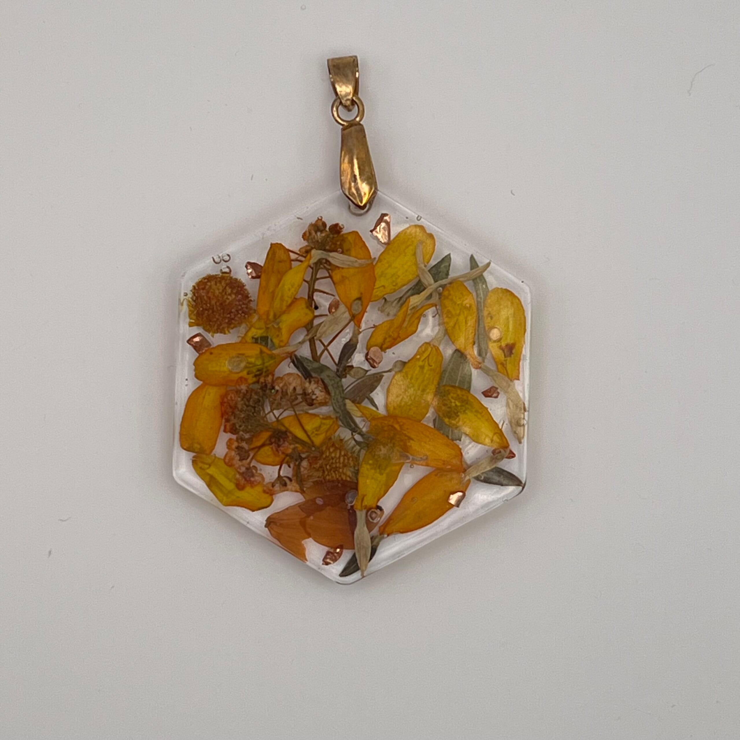 Pendentif en résine transparente incrustée de fleurs séchées
